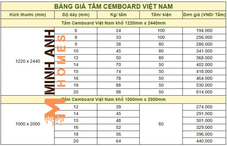 Có thể thấy đây là một mức giá hợp lý, phù hợp với yêu cầu của nhiều công trình từ nhà ở dân dụng đến công nghiệp. Dưới đây là bảng giá chi tiết và mới nhất của tấm xi măng Cemboard lót sàn Việt Nam: